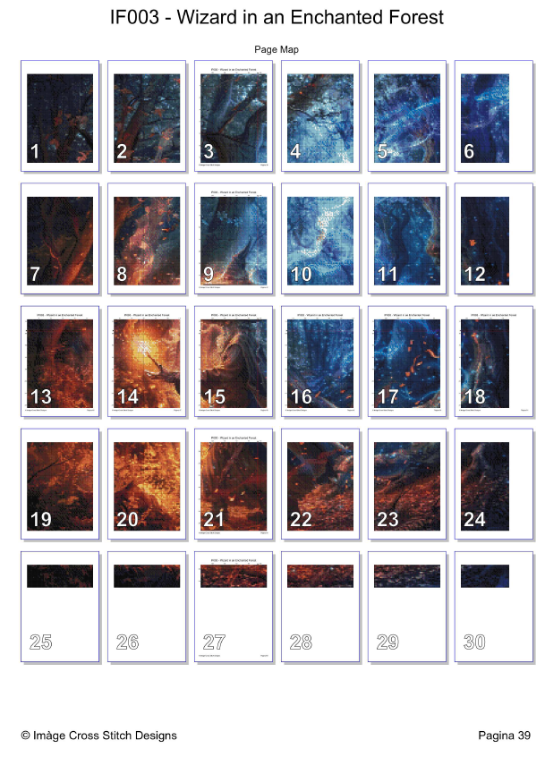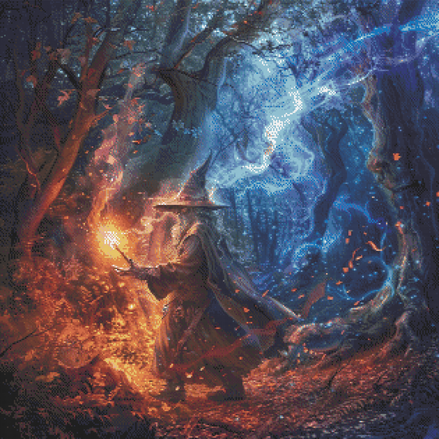 The pattern Wizard in an Enchanted Forest (IF003) depicts a breathtaking fantasy scene. In the heart of a mystical forest, illuminated by moonlight and flame, stands a powerful wizard casting a spell. His glowing staff lights up the dark woods as sparks swirl through the air, blending fiery orange and deep blue tones in a mesmerizing dance of magic and light.